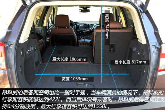 此外,昂科威的后备厢空间也比一般对手强,当车辆满员的情况下,昂科威的行李厢容积能够达到422L。而当后排没有乘客时,昂科威后排座椅还支持6:4分割放倒,储物空间的实际表现也相当实用。最大行李箱容积可达到1550L,基本上连搬家的需求都能够满足。