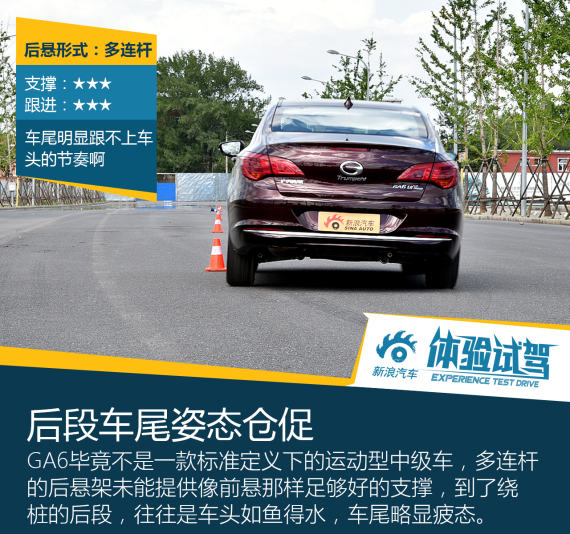 超过4.8米的车身,GA6按理说应该在18米绕桩项目中龇牙咧嘴,可是实际车内的体验超出了预期——轮胎的抓地性、转向精度都令人满意,前轮从始至终都勤勤恳恳地咬紧地面,车头机灵的程度甚至让你觉得这不是一款中级车该有的表现。到目前为止,你会发现我一直在夸赞车头,那是因为车尾的情况并不像车头这么乐观。