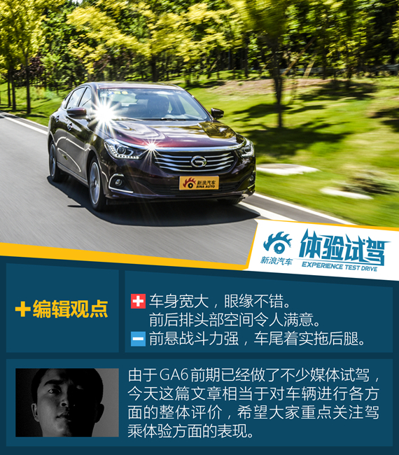 还记得去年年底,我的同事试驾传祺GA6回来,问到他这车怎么样,他说:“可惜了。”有啥可惜的?原来是场地试驾中居然没开出这辆车的底盘极限。嗯,考虑到安全问题,活动方一般都会限制编辑们的发挥,完全可以理解。不过那句“可惜了”着实让我对这台中型车产生了不小的好奇心。这回好了,新浪汽车自己拿到了一台GA6,也终于让我有机会摸一摸它的脾气。当然,这次不会有什么遗憾,GA6是不是那种容易相处的成熟暖男,咱往下看便是。