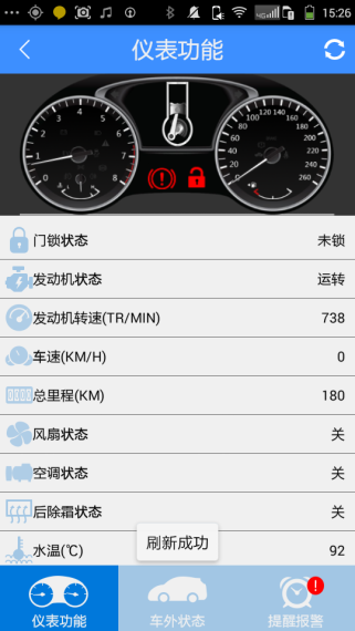 这个功能非常细致,可以将车辆的所有状态实时反映到手机APP中,但是无法从手机反向操作。连发动机转速都有,略有点黑科技。