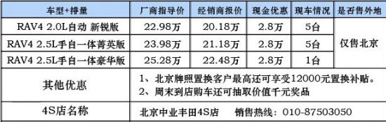 新浪北京汽车讯 近日,编辑从北京中业丰田了解到,全新丰田RAV4 20.18万起售,新浪微博粉丝客户提前享受最高28000元购车现金优惠,北京牌照旧车置换客户最高可再享受12000元置换补贴。限量11台售北京地区,周末到店还可抽取价值千元礼品,置换分期有机会享受0首付0利率0月供。具体优惠信息见下表: