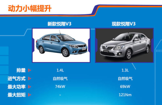 现款悦翔V3搭载一款1.3L发动机,据悉新款悦翔V3将搭载一台长安汽车自主研发的Bluecore 1.4L发动机,最大功率为74kW,长安旗下另一款小型车CX20同样配备了该款发动机。相比现款车型使用的1.3L发动机(最大功率69kW,最大扭矩121Nm),动力性能将实现小幅提升。传动方面,与发动机匹配的或为5速手动变速箱。