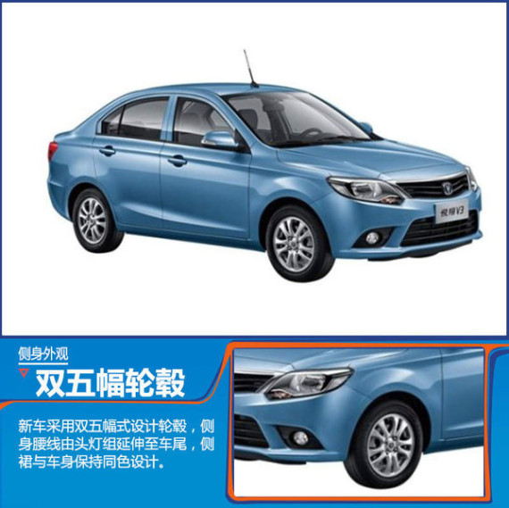 新款悦翔V3在侧身设计方面并未作出过多改动,整体造型设计中规中矩,腰线贯穿整个车身侧面且微微上扬,为侧身视觉效果增添了亮点,轮毂采用双无幅式设计。目前长安方面未公布新车尾部图片,但从此前曝光的谍照图来看,新款悦翔V3尾部基本延续了现款车型设计,整体风格与前脸相呼应。此外长安汽车、悦翔V3等徽标分列尾箱两侧,整体布局与现款车型一致。