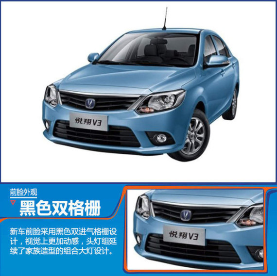 新款悦翔V3整体外观延续了现款车型的造型设计,在细节处有诸多改动。前脸采用长安最新家族式设计风格,上进气格栅为黑色双条形格栅设计,并采用镀铬饰条勾勒轮廓,“V”形徽标镶嵌其上,使整体造型风格视觉上更加动感,并与现款车型有明显区别。头灯组造型设计更加时尚,内部加装了横向灯条,点亮后有更出色的视觉效果。此外新车发动机盖还增加了防水胶条,实用性能进一步提升。