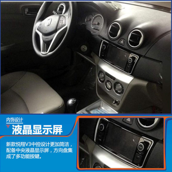 新款悦翔V3内饰基本保持了现款车型设计风格。细节方面,新车方向盘样式有所调整,并增加了多功能按键,中控台上配备有液晶显示屏。中控台功能布局更加简洁,旋钮的样式和背景色有所改变,为新车内饰设计增添了新鲜感。近期上市的新款逸动、致尚XT等车型均在功能配置方面有所升级,新款悦翔V3预计也将在功能配置方面有所调整,为用户提供更出色的用车体验。