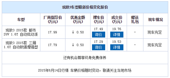 新浪银川汽车讯 近日,编辑从观致汽车宁夏佳和致远4S店了解到,观致3现车销售,颜色可选,目前购车部分车型可优惠0.50万元,感兴趣的朋友可以到店咨询购买。