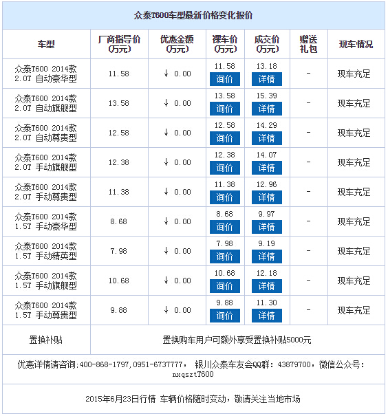 新浪银川汽车讯 近日,编辑从众泰汽车宁夏麒升4S店了解到,众泰T600现车销售,颜色可选,购车暂无优惠,感兴趣的朋友可到店咨询购买。