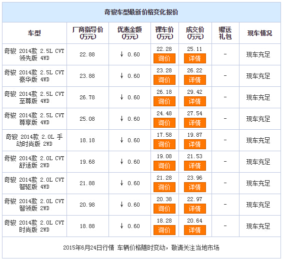 新浪银川汽车讯 近日,编辑从东风日产宁夏弘胜4S店了解到,奇骏 (配置|询价)现车销售,颜色可选,目前购车部分车型可优惠0.60万元,感兴趣的朋友可以到店咨询购买。