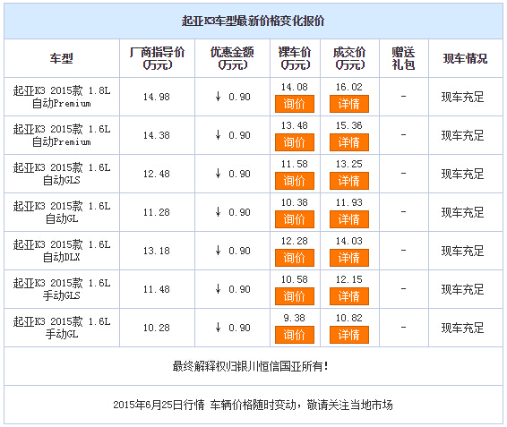 新浪银川汽车讯 近日,编辑从东风悦达起亚宁夏天利4S店了解到,起亚K3 (配置|询价)现车销售,颜色可选,部分车型购车优惠0.9万元,感兴趣的朋友可到店咨询购买。