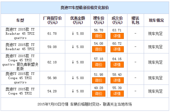 编者建议:奥迪TT具有优良的性能、时尚的外观和精细的内饰,是一款性价比较高的运动型轿车,喜欢的朋友不妨关注一下。