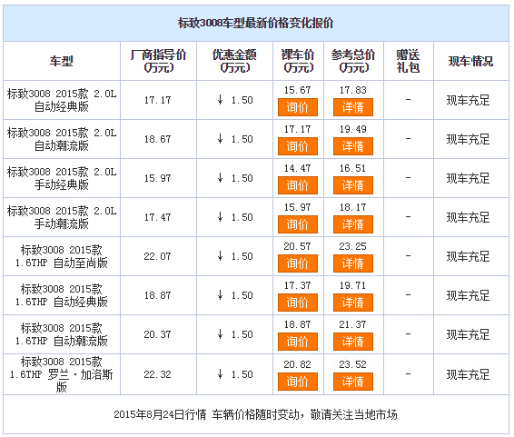 新浪银川汽车讯 近日,编辑从东风标致宁夏标龙4S店了解到。标致3008现车销售,颜色可选,目前购车部分车型可优惠1.50万元,感兴趣的朋友可以到店咨询或电话垂询。