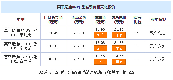 新浪银川汽车讯 近日,编辑从英菲尼迪宁夏润德4S店了解到,英菲尼迪ESQ现车销售,颜色可选,部分车型购车优惠3万元,感兴趣的朋友可到店咨询购买。