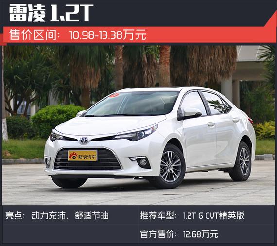 推荐理由:1.2T+CVT变速箱的动力组合,不仅让涡轮增压动力的输出平顺同时也更为节油。雷凌1.2T车型分为新锐版、精英版与豪华版,其 中精英版属于中配车型,在标配VSC车身稳定系统、上坡辅助、前排侧气囊等安全基础上,更比新锐版多出了天窗、铝合金轮毂,因而这多花的7000元还是很 值得的,毕竟这些配置对于多数国人而言是喜爱的。