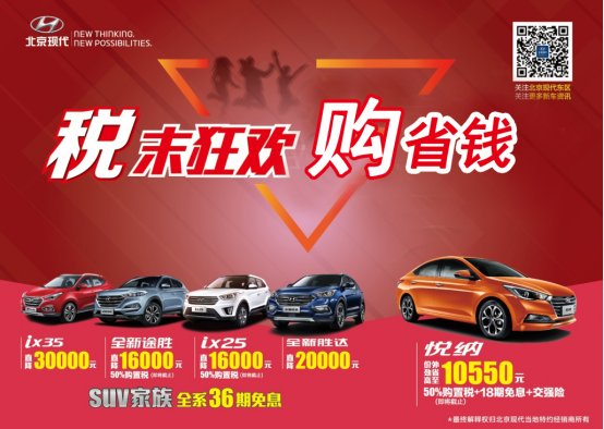 北京现代税末狂欢购,让您停不下来!六重好礼,让您省钱省到手软!