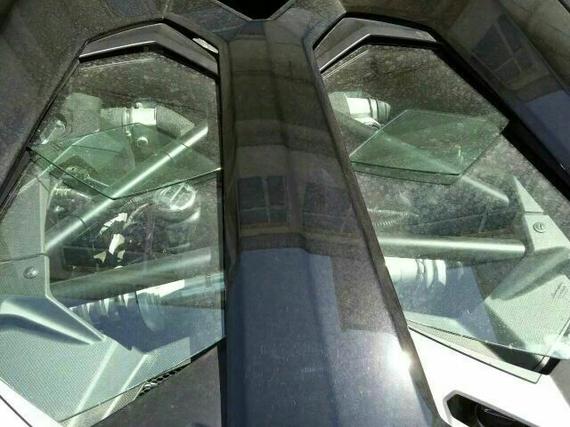 车身侧面造型延续了兰博基尼一如既往的力量感与锋利线条,剪刀门作为“大牛”的经典特征毫无悬念的得以保留,但与其他兰博基尼不同的是剪刀门是斜上方开的。巨大的进气格栅在面积上明显大于上代车型,这也是为了给发动机提供更多的空气以及更好的进行冷却。不管是前大灯还是进气口或者是尾部设计都明显加入了许多Reventon的设计元素,整车的六边形设计风格显而易见,充满了科幻感,将新“大牛”的嚣张气焰提升到一个新的高度。这台展车配备的黑色莲花形轮毂同样是兰博基尼的经典款式,可以说Aventador将品牌传统特征和最新设计潮流进行了完美的融合。