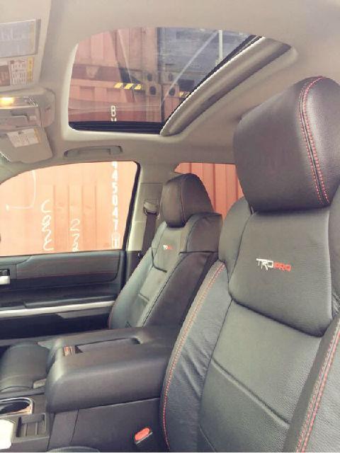 (坦途TRDPRO内饰)坦途TRDPRO的内饰是黑色主题带有红线缝制,真皮座椅是运动款,而且带有TRDPRO绣标,包括中控和仪表都是红线缝制的,除了内饰的独特之处就是轮毂是熏黑的还有中网以及门把手。而且属于少数量产车型,很稀有。稀有度是其一,最重要的就是最强的避震和底盘悬挂,这也是这款坦途为什么价格最昂贵的原因。购车咨询热线:182-0221-4644苏经理(电话通同微信)
