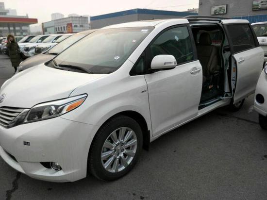 配置:17款塞纳3.5 四驱 Limited 顶配 白/棕,八速,大马力,光感,氙灯,并道,双天窗,吸顶DVD,智能钥匙,一键启动,JBL音响,真皮座椅,前排座椅加热,前后电眼,导航,倒影,方向盘加热、真皮方向盘桃木内饰,两侧电动门、电动后尾门、行李架。发动机3.5汽油长5085*宽1985*高1810*马力300变速箱8速V6自然吸气