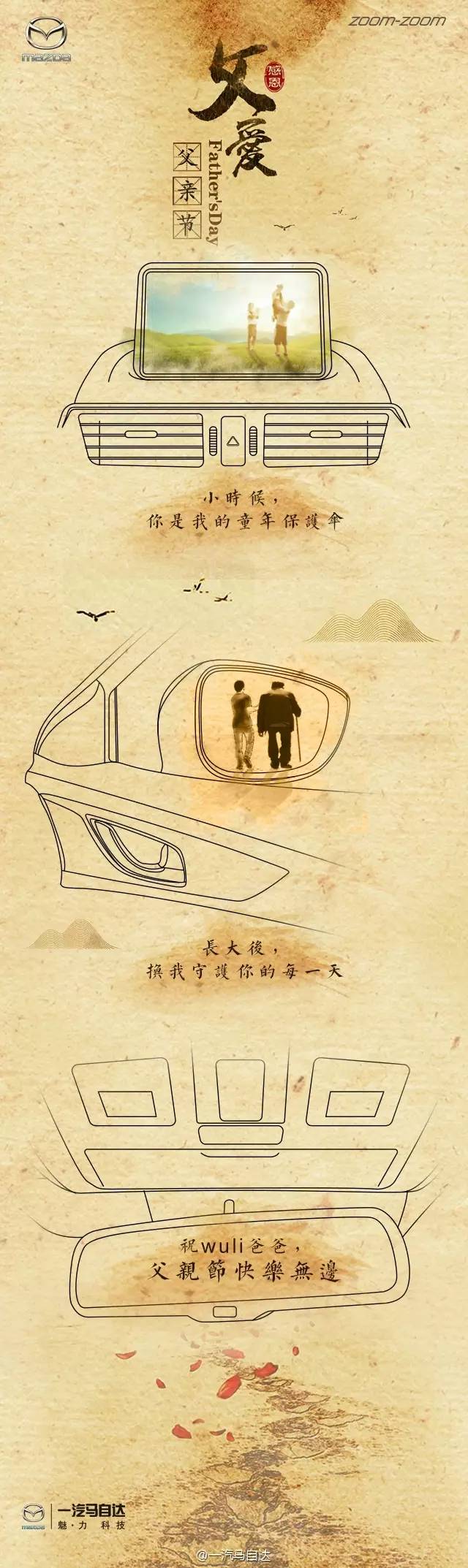 今年的父亲节,我们盘点了一下那些优秀的汽车品牌宣传和促销,小伙伴们从下面收集到的盘点里,在留言区选出最打动你的那一款,点赞数最高的前五位可获得由营销新说提供的父亲节小礼物哦!