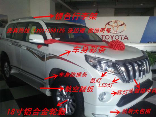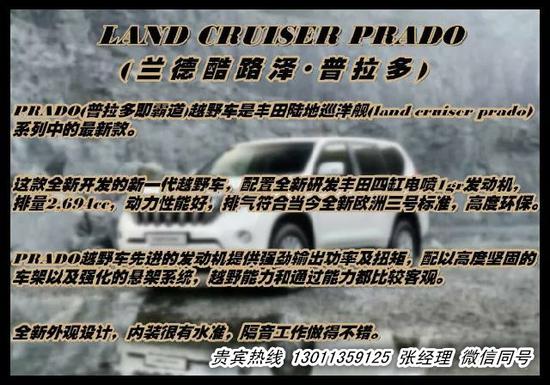 今日,中国天津鸿兴行国际贸易有限公司新到2017款丰田霸道车源现车到店,丰田SUV霸气十足,天津 现车销售热惠不散场显尊贵身份,超值爆惠限时秒杀,配置丰富手续正规,更多优惠信息请致电商家, 为您提供最新最快的行情。贵宾热线 13011359125 张经理 微信同号