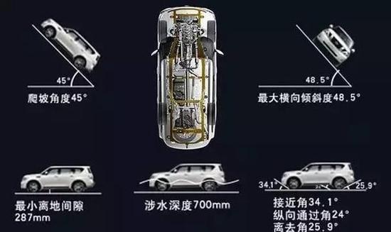 途乐5.6LE虽然车身尺寸庞大,但似乎对它的通过性能并没有太大的影响。从下图可以看出,不管是离地间隙、涉水深度、爬坡角度,或者是接近角、通过角、离去角,途乐的数据都相当可观。