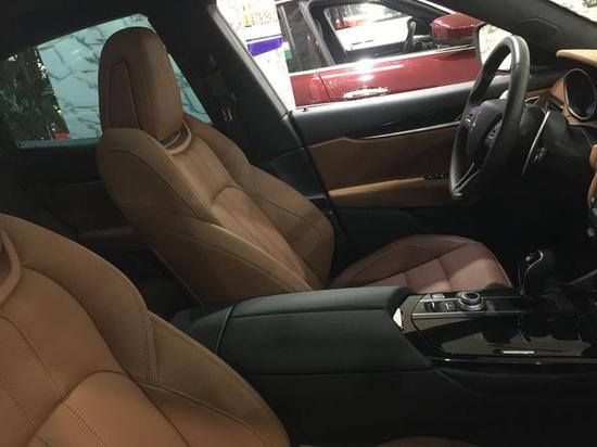 内饰方面:该车中控台的布局和三辐方向盘的造型与Ghibli较为相似。中控台液晶显示屏尺寸较大,下方是物理按键,挡把旁边还有个大的控制旋钮;挡把四周和车门内衬板中间以木纹点缀,意在提升档次感;座椅尺寸宽大且厚实,想必舒适性及包裹性均表现不错。