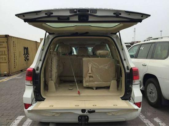 近日从天津京津众泰国际汽车贸易有限公司了解到17款丰田5700配置: 天窗,八座,真皮座椅,前座椅通风,电尾门 12气囊,底盘升降,雷达测距 360度环影,,低速蠕行系统,并道辅助,车道保持,八速变速箱,双差速,桃木内饰,桃木方向盘,20轮,氙气大灯,全车镀铬,四门智能卡,前小杠,小尾翼,前后电眼,后视镜折叠,KDSS悬挂系统,冰箱,后排娱乐 JBL音响 电尾门。