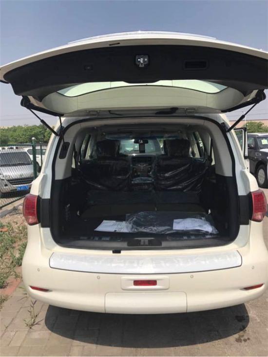 17款英菲尼迪QX80中东版5.6L配置: 398马力 V8 7挡手自一体 全时四驱 八个气囊 胎压监测 车身稳定系统 环车影像 定速巡航 陡坡缓降 中央差速锁 电动天窗 铝合金轮毂 电尾门 行李架 一键启动 无钥匙进入 多功能真皮方向盘 腰部支撑 后排娱乐 雾灯 氙灯HBMC液压车身平衡控制系统 BOSE音响13个扬声器,自动开关双氙气大灯,带弯道辅助照明系统,集成式日间照明,远光灯辅助,主驾10向调节,副驾8向调节,,停车辅助,遥控启动 ,MOD第三代环影,座椅记忆,第三排电动,22轮。