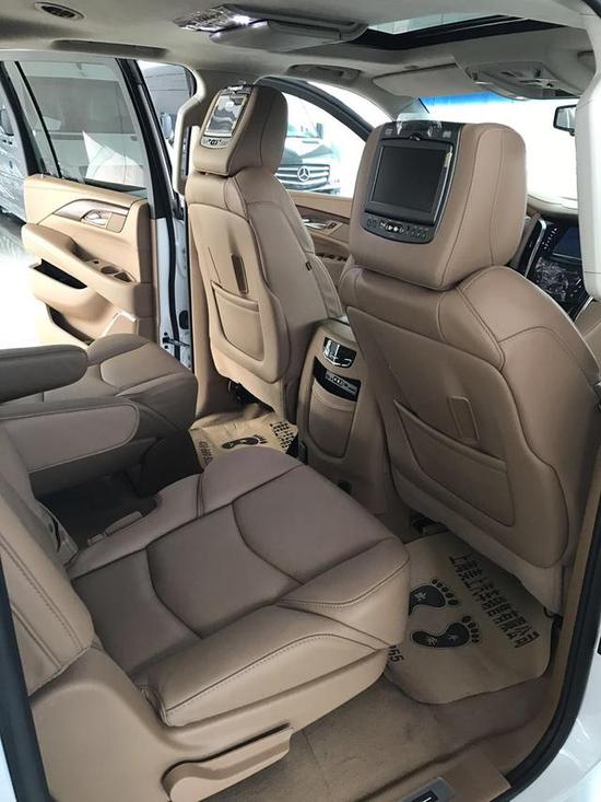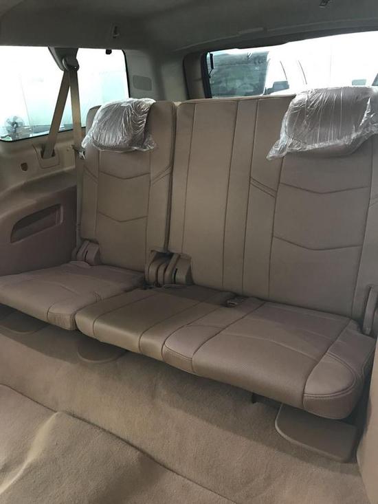 细节方面:17款凯迪拉克凯雷德的真皮桃木多功能方向盘可电加热,三区域独立可调节空调可由三排乘客分别控制温度,配置吸顶DVD是单选配置。