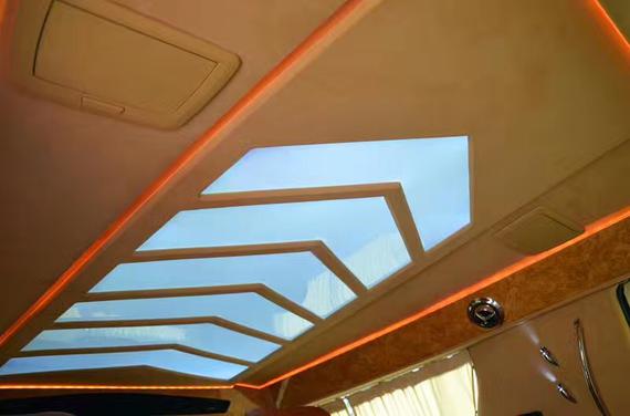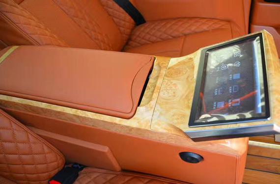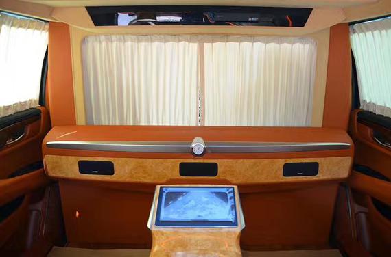 (客舱)豪华多媒体影视墙,nappa真皮吧台,nappa真皮中央扶手,隐藏式储物格,顶部Alcantara面料,nappa打孔真皮航空座椅,整车私密窗帘,游艇级柚木地板,隔音隔热整体强化,空气净化系统,进口钢琴烤漆实木地板,实木地板隐藏式储物箱,辅助充电系统(AC220v,DS5v),镀铬拉手,带灯仪容化妆镜,电动隔帘