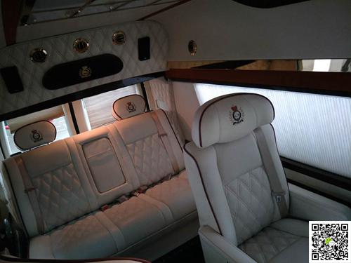 配置:1。霸气外观,整车镀铬装饰2。驾驶舱配有车载冰箱3。瑞士进口的咖啡机4。前后舱通讯系统5。采用世界顶级音响6。电动窗帘7。豪华车载吧台8。豪华德式时钟9。一键式启动功能10。两个独立的加大加宽航空座椅可按摩加热放平,旋转11。后排电动沙发床可完全放平12。配有空气净化器13。整车内饰由高光泽桃木装饰14。后舱独立的触摸操控屏15。内饰颜色采用双拼搭配,缓解视觉的疲劳16.360度的环车影像增加了行驶的安全性17。车尾由柚木爬梯装饰18.20寸超大轮毂,增加了整车的越野性19。内饰空间大,便于行走20。劳斯莱斯的空调出风口