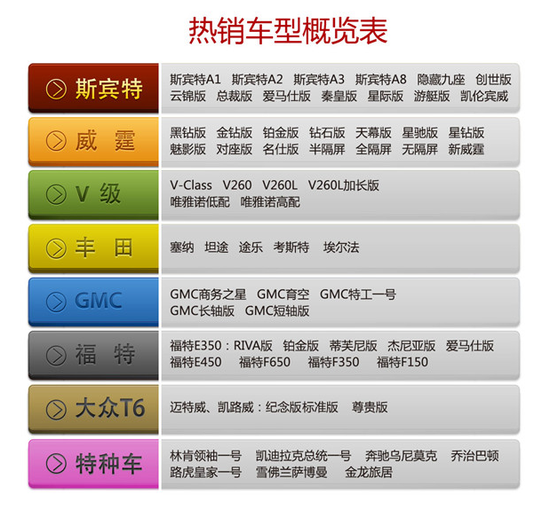 更多优惠促销请致电主营:奔驰、gmc、福特大众、林肯、凯迪拉克商务车、房车;以及各种特种车、加长车整车销售;并提供整车改装、个性化定制、私人定制;二手房车商务车收购、置换;房车商务车租赁等业务;