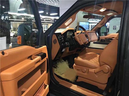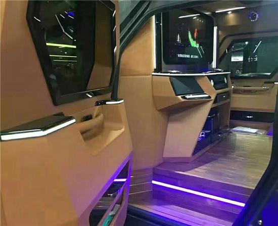 内饰采用了双色混搭,4座,座椅纯手工爱马仕真皮缝制,驾驶舱内有夜视系统、卫星导航、防生化毒气系统、供氧设备等安全设备,还有多媒体影音视讯系统、高科技卫星侦测系统。18k金标,3级升降,32寸液晶电视,纯手工真皮,苹果电脑系统。