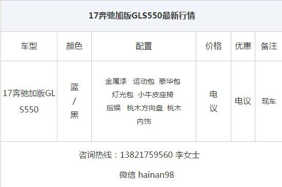 [天津港口行情]近日,在天津铭扬汽车贸易有限公司了解到17奔驰加版GLS550现车到店,天津现车销售热惠不散场显尊贵身份,超值爆惠限时秒杀,配置丰富手续正规,更多优惠信息请致电商家,为您提供最新最快的行情。