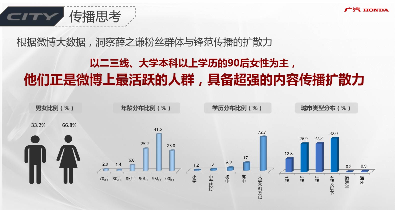 李卫华(新浪华南渠道经理):在此之前,我们与广汽本田的合作基本上以产品曝光类的硬广为主,此次首度大规模尝试深度内容营销,对于合作双方来说,都算是营销创新。在此前,我们大多利用单一的微博商业产品,比如:粉丝通、话题定制等。