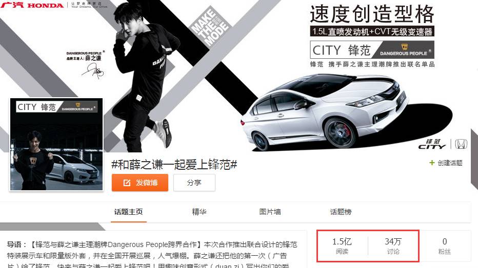 高苏琳(新浪华南汽车策略总监):其实并不是我们想到把薛之谦和锋范联系到一起的。早在2016年伊始,广汽本田就已经与薛之谦进行深度合作。不过在我们看来,薛之谦在粉丝中的形象也切合锋范的特点。此前联合拍摄的MV,联名设计特装车、深度定制联名T恤更是将“锋范”与“薛之谦”这两个名词在一定程度上进行了捆绑。在这期间,微博也同时策划了“和薛之谦一起爱上锋范”这个话题,最终收获了1.5亿阅读量和34万讨论,让薛之谦的粉丝对于锋范有了较为深刻的认识。
