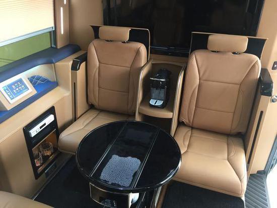 奔驰斯宾特车载卫星电视机顶盒、蓝光DVD、中控触摸屏、BOSE音响主机、电热水器等设备都集成在这个吧台左边,为保障贵宾舱乘客有满足舒服的环境,这款斯宾特可谓是把空间利用到了极致。您经过这几张实拍图也能看到,吧台处两张隐藏座椅也是该款车型的一大亮点,座椅中心设置了电动桌板,上面还有双杯槽、进口咖啡机,各种便利设备应有尽有。VIP贵宾热线:18630811701 (同微信)范经理