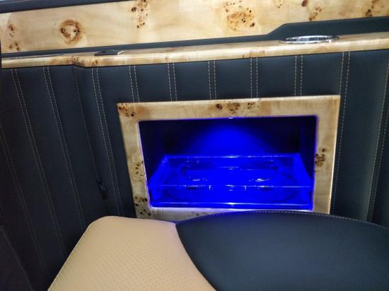 从隔断方式来看,喜欢私密性高的,可以选择驾驶舱与贵宾区用升降液晶电视隔断,前后舱交流需求大的,可旋转未隔断化改装,也可选择带豪华吧台半隔断形式。整车内饰以独具神秘色彩的爱马仕皮革搭配,甄选进口头层牛皮材质,联手世界顶级手工缝线商,只为缔造最舒适的触碰感受,驾驶舱顶置32寸可升降液晶电视,下方扶手箱配置也经过精心重制,集成了置物杯架,压缩式车载冰箱与多功能USB接口,驾驶舱座椅背后集成有S级的隐藏小桌板设计,为你的商务行程助力。