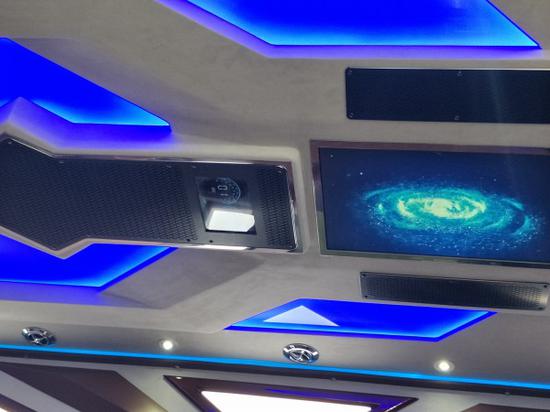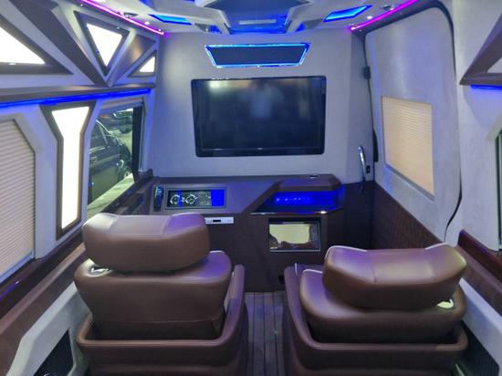 豪华真皮工作吧台,亚克力杯架、雀巢咖啡机。后舱36L大容量车载冰箱。前后舱联络电话。乘客舱前排奢华一键式记忆电动折叠航空首长席,附有加热、通风、电动控制优雅变型、360度全方位自由旋转,多项气动按摩功能缓解工作疲惫。后排三连电动沙发床,座椅可进行靠背翻转、坐垫位移、腿拖翻转等一系列电动调节。后舱全景:迈巴赫式满天星灯板,流星灯,阅读灯,吧台装饰灯,白色灯带,交相辉映,营造舒适浪漫氛围。