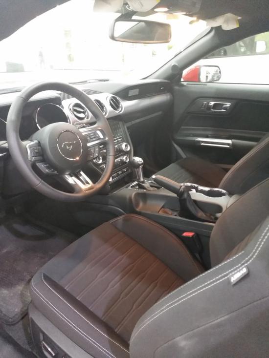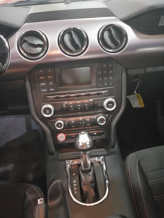 内饰方面:内部铝质饰件更加让人感受到野马的技术之精良。三幅方向盘直径很大,握在手里就会有种掌控一切的感觉。宽大的真皮座椅和门板整片的塑料都是绝对的豪车范儿。内饰简单中却透露着一种原始的粗犷和令人上瘾的刺激感。时尚的功能性配置及其精确的制作工艺为劲车设计设定了新的标准。中控台搭配银色装饰面板提供了不错的层次感。