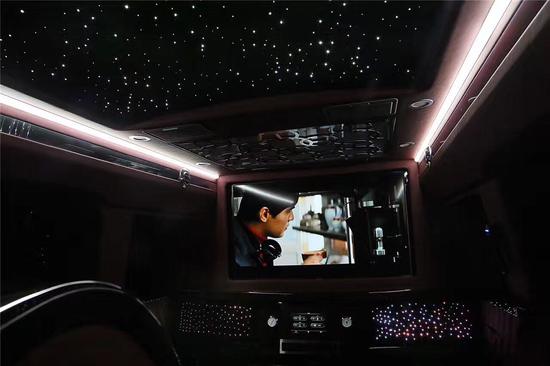 路虎揽胜皇家一号加长版前方座椅加热带按摩功能,车载冰箱一应俱全,由于车比较长,所以配备了前后对讲功能。车内配有一个类似于KTV似的吧台,带蓝光SONY牌DVD,索尼高清LED电视,以色列卫星天线,以及空气净化器,车内带氛围灯。