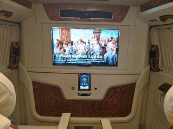 上文中有提到此款奔驰V260为加高顶车身,实际高度呢在2米到2米1之间,所以进入常规地库也是游刃有余(标注限高2米实际高度一般在2米3左右),然而这种高顶改装车一般均为前后舱全隔断式设计,一来后舱的密闭性与隐私细节得以保障,再一个作为后舱丰富娱乐性的主体体现,32寸液晶大屏也需要有足够坚实的支撑。