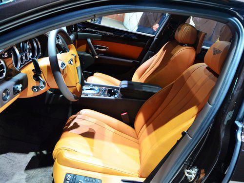内饰方面:2017款宾利飞驰内饰全部是由英国克鲁郡工厂的工匠们手工打造的,手工的缝制,表面的打孔处理,还有菱形缝制的纹路都能给人带来奢华的视觉感受,这辆车选装的胡桃木,整车使用了近10平米天然木料。三幅式方向盘由胡桃木与真皮组成,握感相当棒。仪表盘内使用了大量的镀铬边框,表盘设计较为复古。推拉式的空调出风口,开闭之间的阻尼适中,手感很棒,精致的镀铬工艺及造型更是让人欲罢不能。