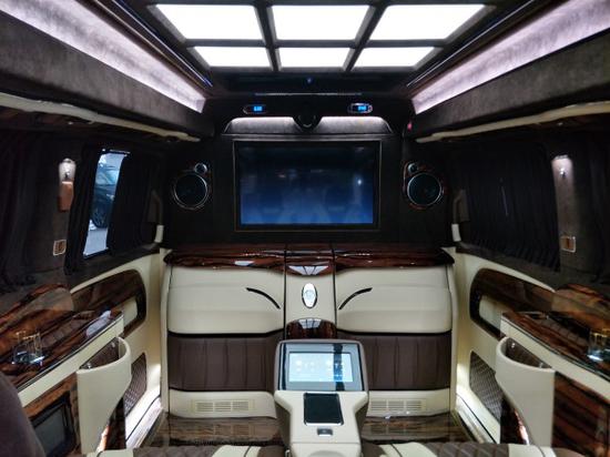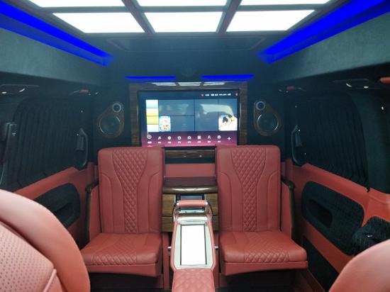 第二排吧台改装两张隐藏秘书座椅,32寸可升降电视以及5.1BOSSS音箱,后仓都采用雀眼木装饰,以及第三排两大奢华老板座椅8向调节,一键式舒展开,电动窗帘,电动桌板,以及咖啡机,奢华刻图纹案地板,以及鹿皮顶加迈巴赫顶。