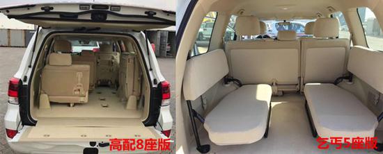 17款丰田酷路泽4000中东乞丐版为5座,而除乞丐版外其余高配版本酷路泽均为8座版(第三排为壁挂式座椅)