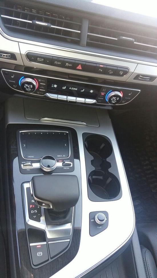 2017款奥迪Q7采用游艇杆式电子档杆,表皮覆盖真皮包裹,触感温柔舒适,P挡由传统的上推挂档改为电子按摩方式,按键在手握换挡杆的拇指位置,使用起来非常方便。控制MMI系统的all-in-touch触摸板功能十分强大,表面由炭黑色的高级材料制成,可以支持多指手势对系统进行操控,操作逻辑严谨,且非常人性化。