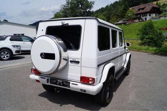 2017款进口奔驰G350备胎位置向右侧移动,也只有在备胎支架打开后,放倒式的尾箱门才能打开,高位刹车灯则通过一根钢管连接在备胎架上。