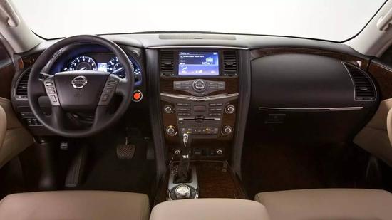 内饰有浅色和深色可选,整体布局比较复古,皮质包裹与木纹并用的设计虽然略显老气,但在这辆硬派SUV上感觉还是很协调;整体操作以按键控制为主,虽然复杂的按键布局颜值不高,中控屏幕也不够大,但是按键的体验要比触摸更实用,同时可靠性更高;四辐式多功能方向盘不仅尺寸大,而且相当粗壮,可以控制音响、定速巡航、碰撞警示、车道偏离警示以及并线提示等功能。