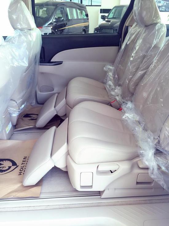 17款丰田普瑞维亚打双电动遥控侧滑门后,是中排独立座椅,这两张位居中排的座椅是将Previa一举推向极致的幕后黑手,这两张Ottoman头等舱高级座椅还附加了可调式脚靠垫,由座椅侧面控制扳手就能够控制座椅的角度,以及脚靠垫的角度。