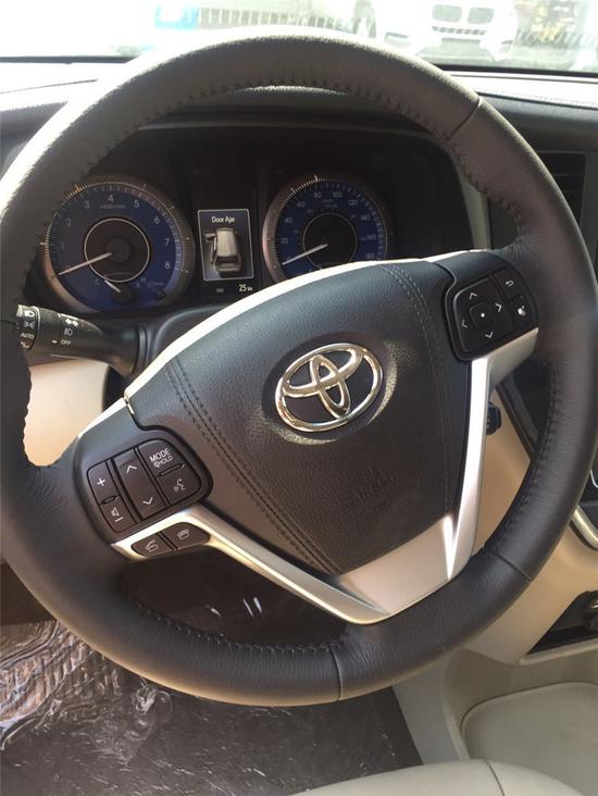 内饰方面:17款丰田塞纳3.5两驱四辐多功能真皮方向盘采用了人体工程学设计,上下两头同样采用了桃木装饰,提升了精致度的同时握感也很舒适。多功能按键集成了蓝牙电话,频道切换,音量控制等常用功能。方向盘左侧按键区域功能丰富,集成了外后视镜调节、ESP、并线辅助、前泊车雷达、大灯高度调节控制按键。