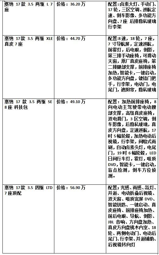 其他方面:丰田塞纳座椅方面标配7座,2+3+2模式排出,空间与埃尔法 (配置|询价)空间一样宽敞。丰田塞纳配仍将会搭载一台3.5升V6发动机,与发动机匹配的将是一台6速手自一体变 速箱。塞纳宽敞舒适后座空间,配上该车安全稳定的行驶系统,保证途中也能舒适地谈上生意。这个价位的MPV,丰田塞纳的发动机可以说是无可匹敌了。购车热线:王亮(非常实在的人)15122221462(同微信 可分期)